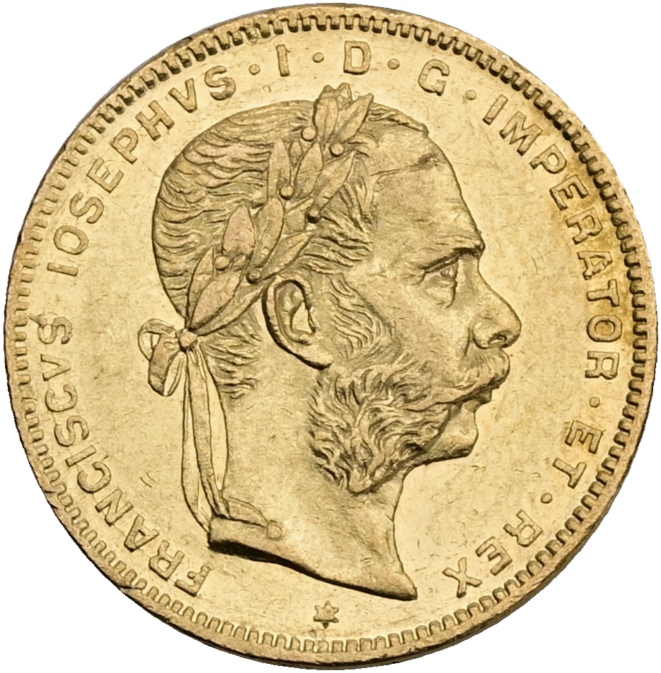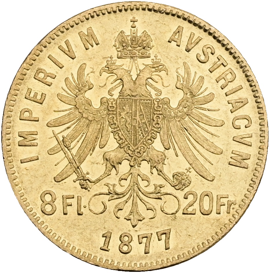 FJI. Zlatý 8 zlatník/20 frank 1877 rakouský Vídeň 2373026