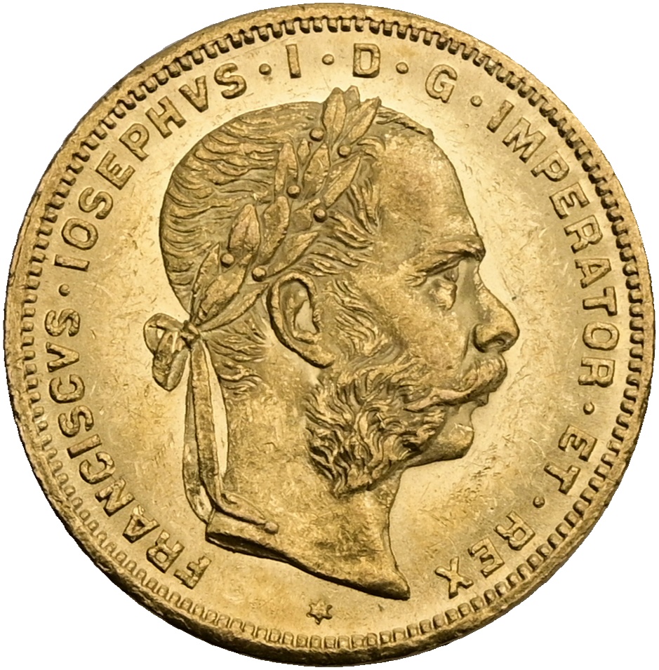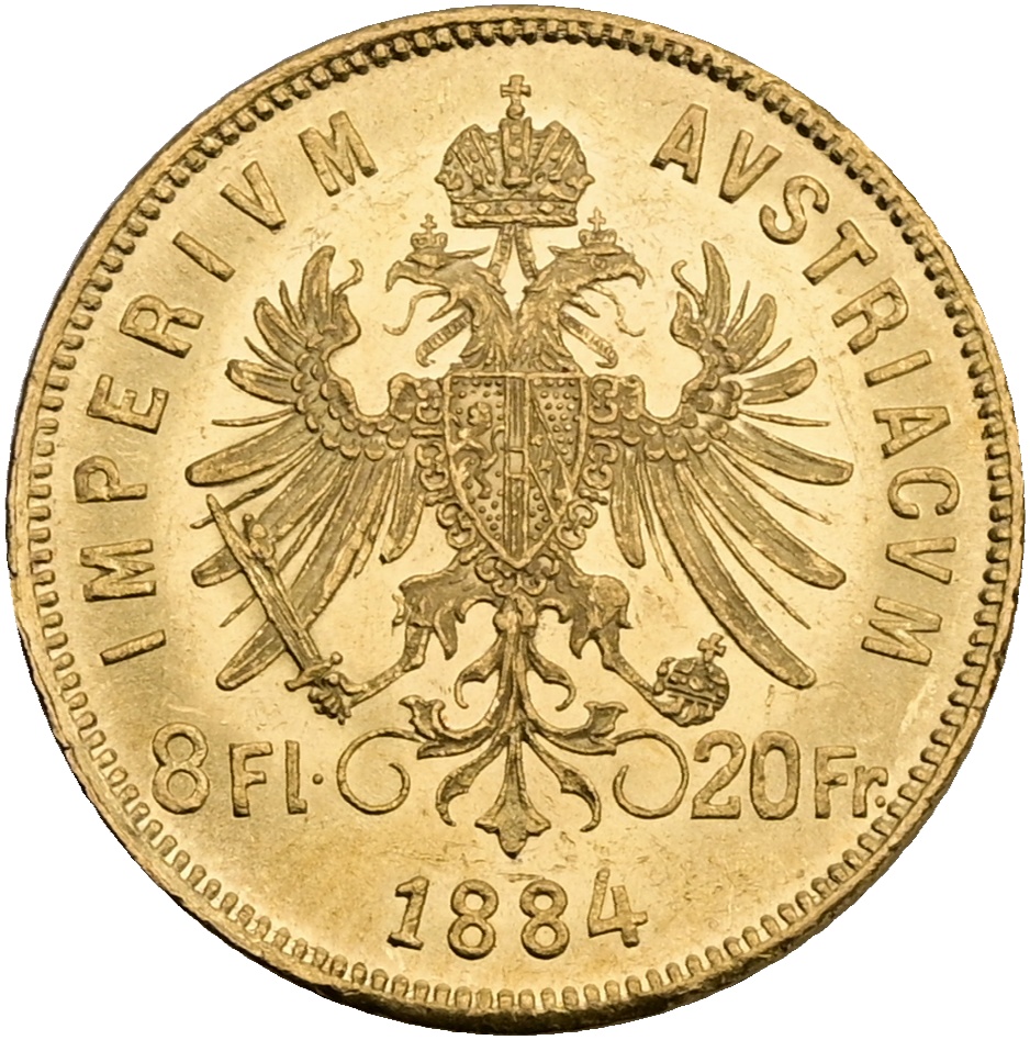 FJI. Zlatý 8 zlatník/20 frank 1884 rakouský Vídeň 2377026