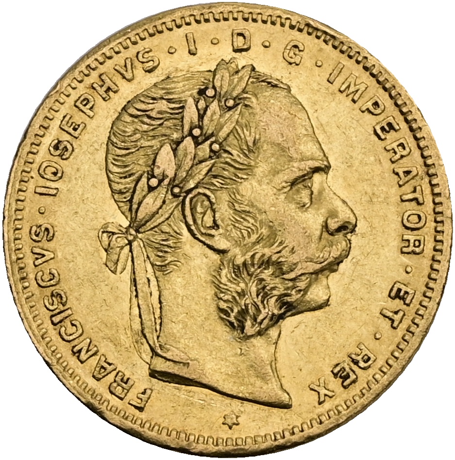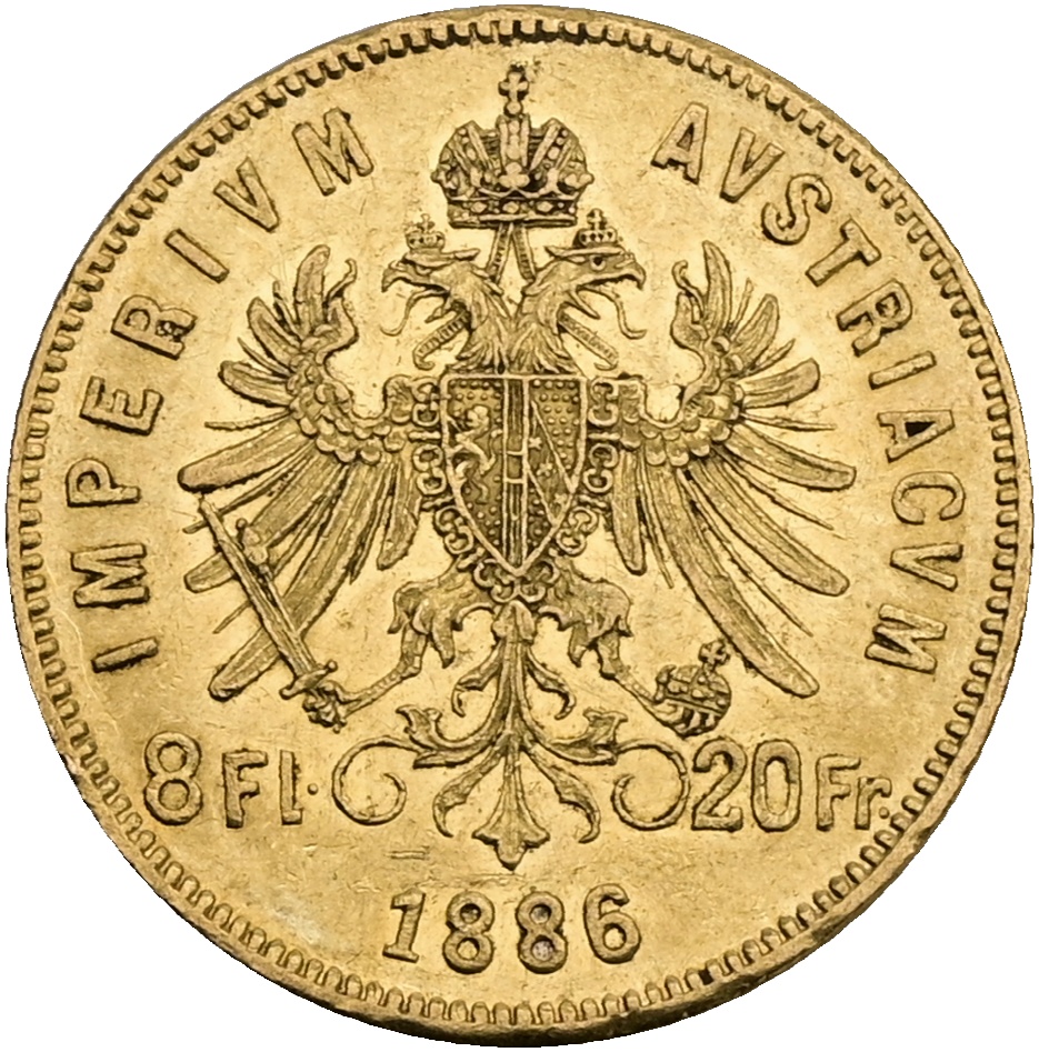 FJI. Zlatý 8 zlatník/20 frank 1886 rakouský Vídeň 2378026